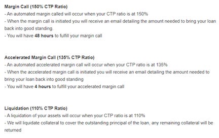 Please be aware that the above-mentioned four options are only available where CTP is above One Hundred and Ten (110) percent. At a CTP of One Hundred and Ten (110) percent, your collateral will be instantly liquidated.