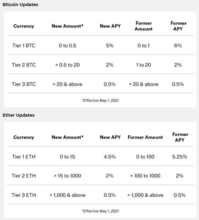 The announcement in part says, “[d]ue to shifting market conditions, BlockFi will be adjusting the APY for several supported cryptocurrencies starting May 1, 2021. These changes will affect Bitcoin (BTC), Ether (ETH), Chainlink (LINK), Litecoin (LTC), and PAX Gold (PAXG).” Blockfi Blog.