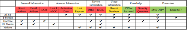 This chart denotes the authentication methods that a 2020 study on this issue observed for each carrier. A checkmark means that a type of information was a component of at least one pathway for SIM swap customer authentication.